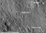 A specially processed NASA Mars Global Surveyor (MGS) image taken by the Mars Orbiter Camera (MOC). The Beagle scientists believe that out of the many thousands of craters and hundreds of square kilometres of Beagle 2’s landing ellipse, no other candidate site has come close to providing such compelling evidence of Beagle’s landing. Impact ejecta can be seen similar to the one produced by MER-A’s front shield in the Bonneville crater and a cluster of symmetrically arranged objects that match a successful gas bag segment separation, dropping the lander to the ground.