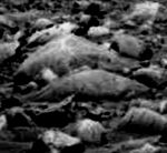 I see what you mean. I could interpret anything to be a face but a Human face is different. I just put these two examples up because I believe that they are the best examples I have seen (so far) Here is more of a close up of the face I see in the big rock (or whatever it is) from SPIRIT SOL 87. It "appears" to be a human peering out of a suit of some type, only his eyes, forehead and part of his nose are visible.