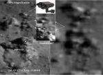 The anomaly below appears to me to be a very square or rectangular shaped vehicle carrying something on top which appears to have both rounded and sharp features. On the 'actual sized' image there also appears to be a clear path through a boulder field (almost track like) to the right of the anomaly as we look at it. Looks as if the object has just driven right through it. Location supplied on the image. Observations welcome..