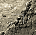 In this slide there seems to be a 5 sided 5 pointed cup sitting on a ridge. The cup casts a shadow on the near-side in line with those being cast by nearby rocks so it definately has a solid form. At 20m across it is of considerable size. I have used magnification on 2 images and have inverted colours on 1 image.