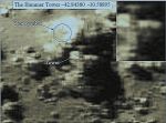 On this visit I want to draw the observers attention to Location 2 which shows 3 or possibly 4 anomalies including a 'Tower' or 'Fort' like structure, a 'wedge shaped' building and a round structure reminding me of a web-cam. The Tower looks to be part of a bigger structure like a Fort with an enclosure and entrances beneath the tower itself. The round object seems to top another structure running away to the left. The wedge shaped structure can be seen from quite a height above the surface. Note the pentagonal or 5 pointed star shape on the side of the tower.