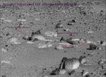 Lightsoff, hello, and do not intend to intrude on your interpretation, but I hope you may be interested in a few observations and opinions here. To begin, the pic is quite obfuscated, that is , faintly smeared and tampered with. These heavier areas are marked on the attached as such. Another error evident is the reversed shadows ( also marked ). There is a multiplicity of simular ( helmut?) shaped rocks present as well. These are, in my opinion, ' placed ' there, as the shadows seem to dark as well. These ' rocks ' are peculiar in, again .. my opinion, not being sedimentary by nature, that is, layed down in and by .. water. Their smoothness I believe is from being worked on by someone .. at some remote time. In effect, these , I believe, were once part of a huge temple complex that was quickly and violently destroyed. These then, are pieces of the Temple Complex itself, and some number of great statues that were part of the site. I consider this possible in particular from one of the ruined carved-rocks, which I have labeled ' Smashed Colossus Head ', lying on its side in the sands. The attached should in fact be self-explanatory of these few observations made on this puzzling picture you have presented. Now that you are armed with some few observations of note, when approaching a possible picture and its subject matter of interest, you should be making some very exciting and perceptive interpretations. The presentation of these I will look forward to indeed! -Morbius