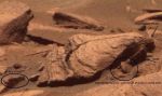 Sory for the delay, but let's get started. I said I would not mention it , but feel compelled to make one last note on the blurring-process used on this ( or any ) pic. From the horizon down note the light blue tint, as this is a major tell-tale sign and special NASA ' signature ', as well, the major crater is totally devoid of any detail, and at that close a distance there should be plenty to see. Having gotten that pet peev off my mind, let's start here with the large stone-covering of the now legendary lizard-man. As the attached will show, it is a perfect fit to the large stone to the left and slightly behind the piece mantioned. Both have a bell-tapered configuration with an attendant flange-edge to it. The main piece has a projecting bump which should fit into the other piece where there appears a large ' chip ' in that stone. These are stone pieces, all of them in fact, which at one time did not belong there, yet fit together, and have gouged huge craters in the sands of Mars. These rocks, the scattered pieces, are part of the larger picture here, and there is one strange yet possible connection. All of these parts of the puzzle , are easily covered here by one simple view. My ' opinion ' is to suggest these ' pieces ' were once part/s of a flying craft or spaceship if you will. How so? Firstly, from the mathematical spacing, machined-parts and geometry of many of the pieces, it would be quite plausible to consider these craft were giant warships made of ... cement. Now don't hang up, or phone the funny-farm on me, let's take a look at this initially puzzling offering. In an anti-gravidic field device or ship, there is no inertia or mass ( weight ). To therefore construct a giant battleship, of any size, merely requires the detailed planning, construction techniques, and will .. to produce these craft. Look at the ceramic heat-plates on our Shuttles, thousands .. all of precise curves and configurations, fitting together precisely. Our aircraft-carriers are put together in giant ' slices ' with a crane moving them along side each other one at a time, and the workmen toiling with incredible precision to make shure it all fits and works. Again, what would be the advantage of cement? For one, it can be poured into exact mould-pieces, along with thousands of others, then connected together in space or otherwise. The casing-stones of the Great Pyramid are cemented together to thousandths of an inch tolerances, and the bond is actually stronger than the stone itself. Yes cement, starting to find it a possibility now? Let's take our missile silos, those huge tubes which house those ICBM death-machines by the hundreds. These silos are made with a specially formulated and terribly expensive cement. A custom cement made with titanium powder and other ' ingredients ' for super-strength. Fact is, these are 2-3 ft. thick walls, and can withstand 240,000 lbs. pressure (psi )! It would take an almost direct nuclear hit to shatter this material. And what kind of cement would a space-faring race a 100,000 years ahead of us produce? Yes, I have seen these smashed pieces in other locations, and believe they were part of a great armada that were shot-down or otherwise made to crash on the surface of Mars, and elsewhere too. The battleship Missouri has an 18" thick steel-hull. Quite a formidable ship in its day.. Yet to bring down a sky battleship with a 2-3 ft. cement-alloy hull defense would require or take some science equal to the task. This sounds like Hoagland's torsion physics and Scalar Weaponry, which I don't quite understand, but anyways these are the buzz-words in those circles nowadays. It may be that after thousands of years of advances even these terrifying weapons will be considered antiquated Micky-Mouse stuff too.