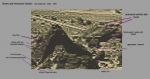 This is the follow-up , and the attachments are of the same area . They include 1. -the distant Twin-Peak , the marked ' Administration Building ' . and the Sentry Site . It is noteable that the camera is exactly lined up with the high spire of the Admin. bld., and continues unswervingly to the apex of the pyramidal ' Twin Peak ', coincidence here ? I am including 2. -a preliminary study of the major or highest pyramid area , which begins to show a row of buildings on the lower slopes , and behind which is seen a road leading , at a reasonable incline from the left base , up to a switchback and on to a group of large buildings about two-thirds of the way up the pyramids facing side . Below and centered on this , in my opinion , man-made pyramid , is an amazing edifice surrounded by neatly laid out smaller buildings of all sorts , spaced in appointed locations on the streets and avenues . Because of its size and central location , it is nicknamed ' the Administration Building ' 3. Below this , and much closer now , a little to the left of the Admin. bld. , is 4. -the Sentry Outpost , this , and the Admin. bld. having been submitted in previous posts , but are now marked and annotated . By comparison with the larger Sentry and Armoured-Vehicle pic., we can see this soldier is now emerging from inside the pup-tent and is now seen to leave . Not only is his vehicle now partially smeared over , but the entire picture has been gone over thoroughly with 'special-editing' applications , and I estimate that there are approximately 100-130 or so other soldiers of his division present ... and for the most part obscured . A possible addendum would mark their locations ... and purpose for being there.