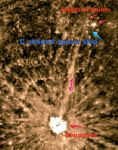 Kuiper Crater Archway. I'm pointing to Pentagon segmented with line at lower corner. The whole structure could be a geodesic style structure. Now, look at the upper right corner to see the city square. Lights on right angle street intersection around rectangular building. Large buildings along streets. Through traffic into archway.