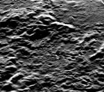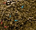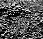 This cutout is just above the bright face, Petrarch Crater, Mercury. The top center shows a bright face and dark body, looking up, laying on hillside. Carved faces all around hill parameter.