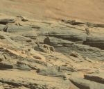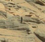 Imho it is just part of the terrain, what has my attention is the upright dark spike in the centre of your first image, the shadow it cast is the opposite to the other shadows in the image